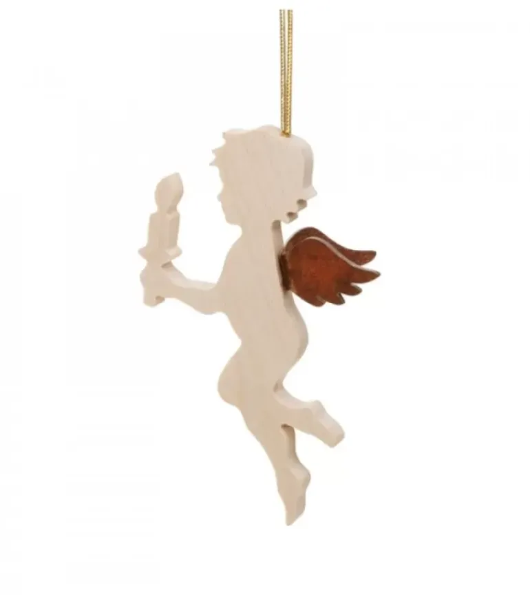 Petit Ange Décoratif A Suspendre, En Bois D’Erable, Tenant Une Bougie Dans La Main.