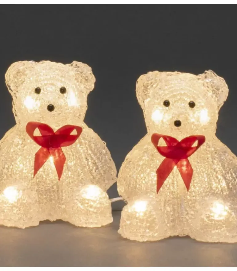 Lots De 5 Petits Oursons Lumineux A Led En Acrylique Avec Ruban Rouge, 40 Diodes Blanc Chaud.