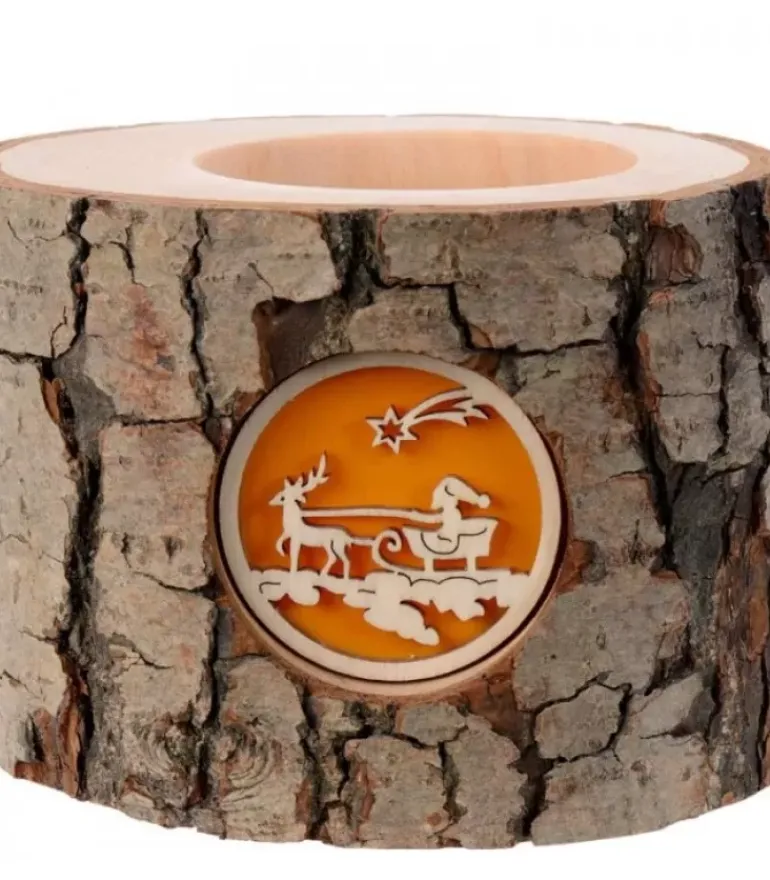 Bougeoir Photophore En Ecorce De Bois De Forme Ronde Dans Un Rondin De Bois Avec Un Motif Translucide D’Un Père Noël Sur Son Traineau Tire Par Des Rennes.
