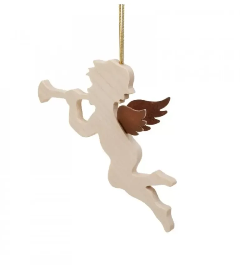 Petit Ange Décoratif A Suspendre, En Bois D’Erable, Jouant De La Trompette Avec Ailes En Metal Oxyde Laque.