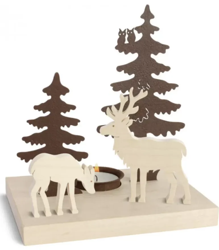 Bougeoir De Table En Bois Décoratif, Cerf Et Biche Dans La Foret.