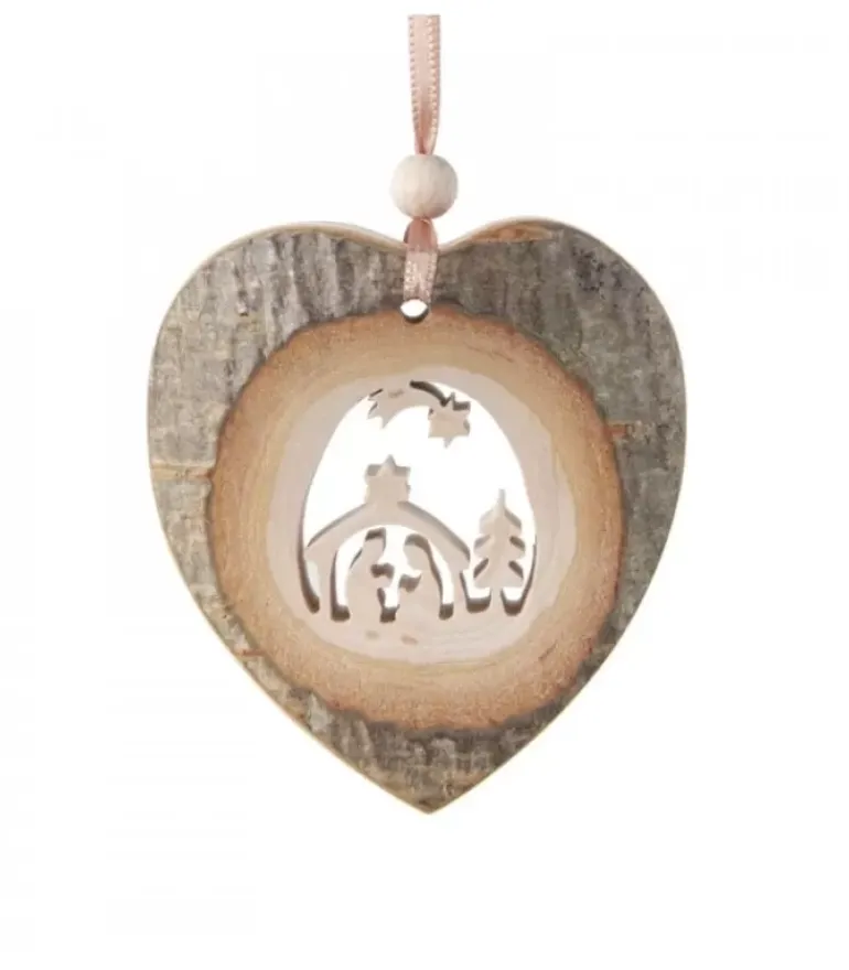 Coeur A Suspendre Avec Motif Crèche Et Etoile Filante Ciselees Dans L’Aubier.