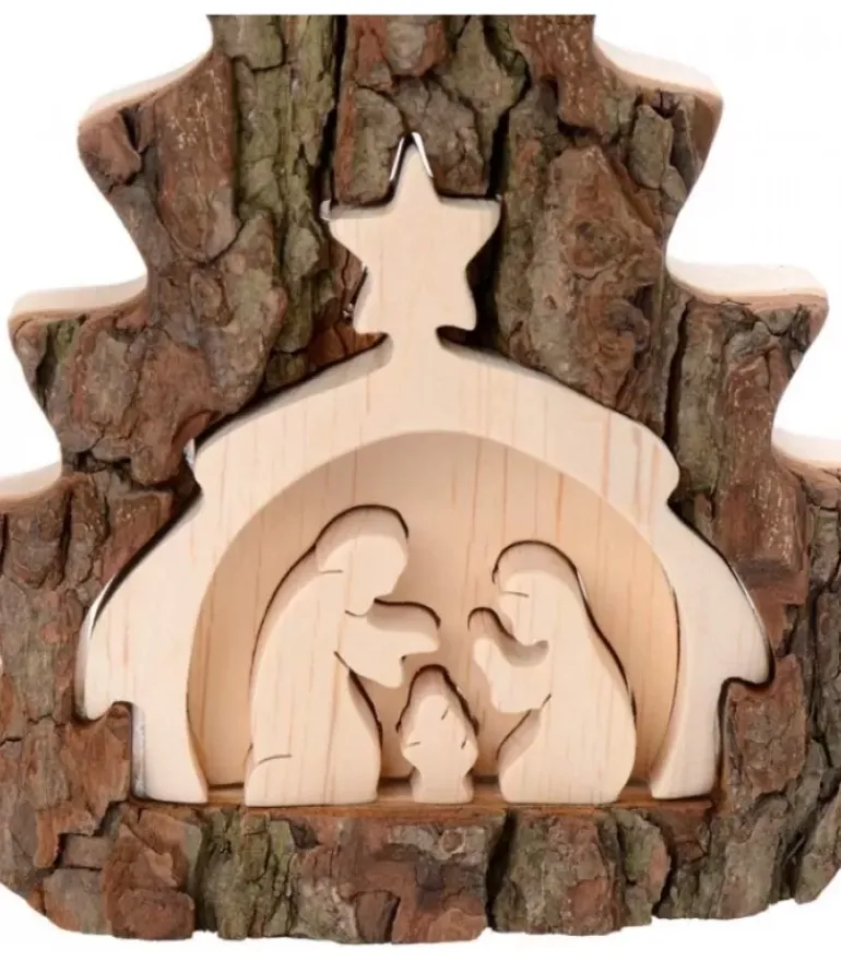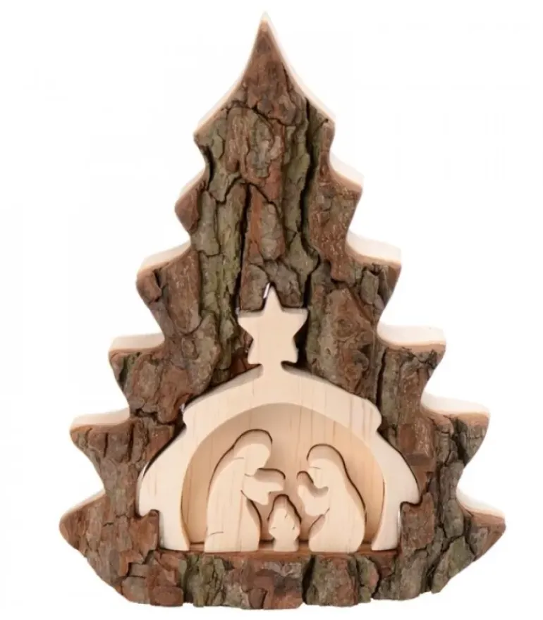 Crèche De Noël En Bois, En Forme De Sapin, Taillee Dans Une Ecorce.