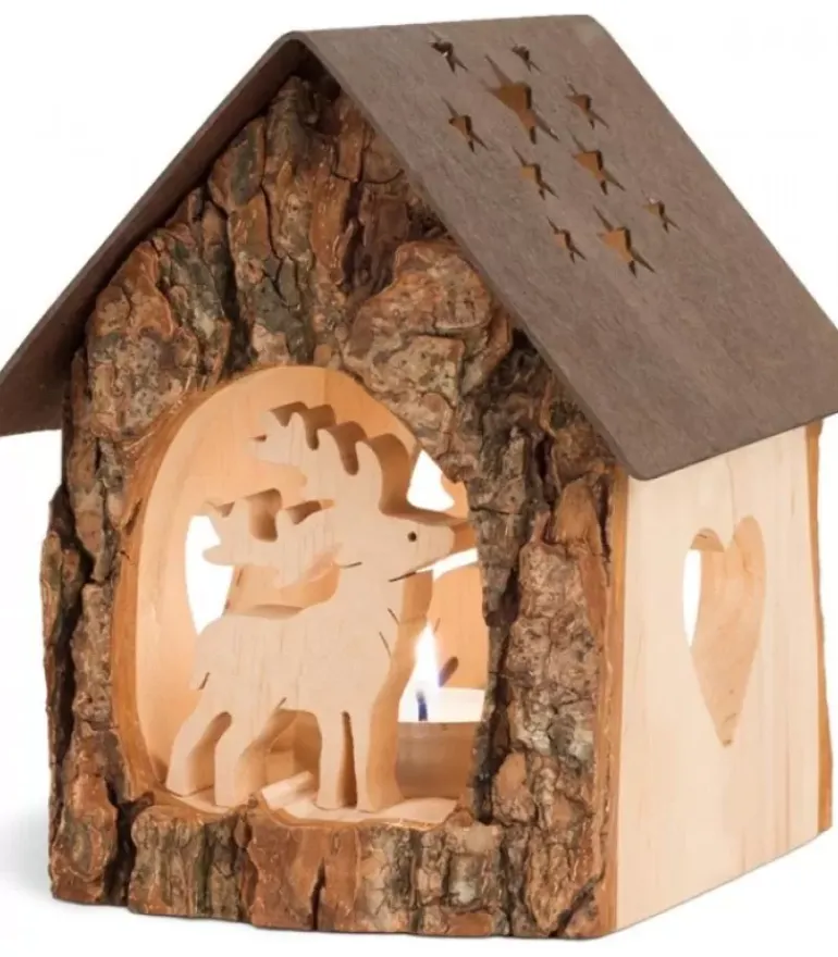 Motif Cerf Dans La Foret En Bois Cisele. Avec Toit En Metal Oxide.