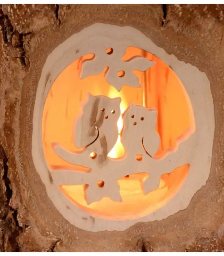 Lanterne Photophore Avec Motif D’Un Couple D’Hiboux En Bois Cisele Sur Chaque Cote. Equipee D’Une Anse Metal.