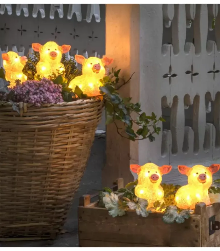 Lot De 5 Petits Cochons Roses En Acrylique A Led, Transparent, 40 Diodes Blanc.