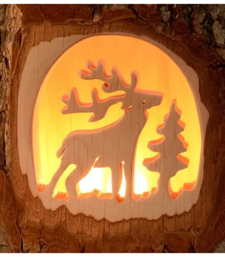 Photophore En Bois Avec Motif Cerf En Foret Realise En Bois Cisele.