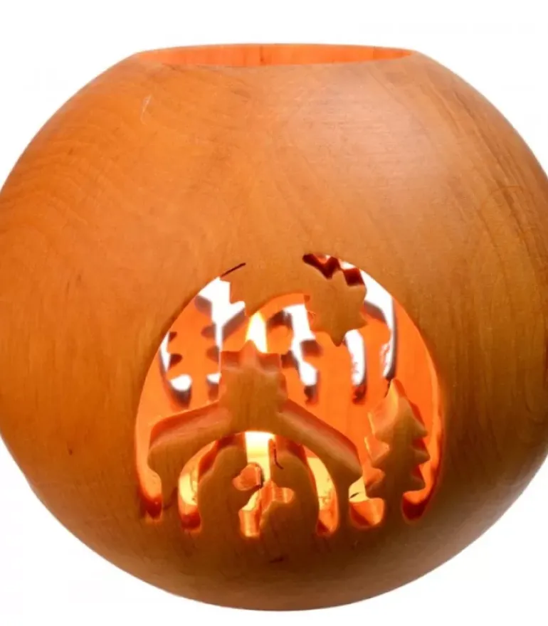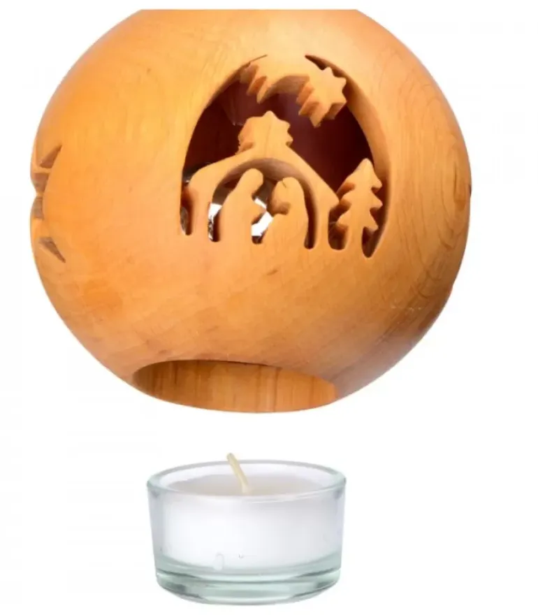 Photophore En Bois Naturel De Forme Ronde Avec Une Crèche De Noël Découpee Et Une Etoile Sur Les 2 Autres Faces.