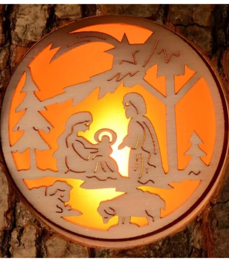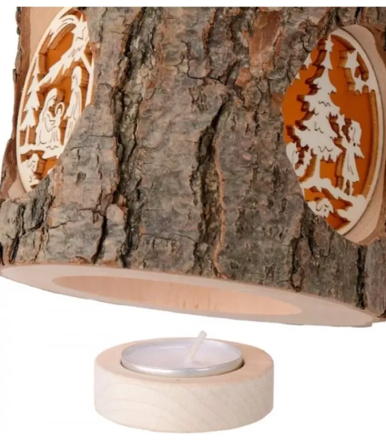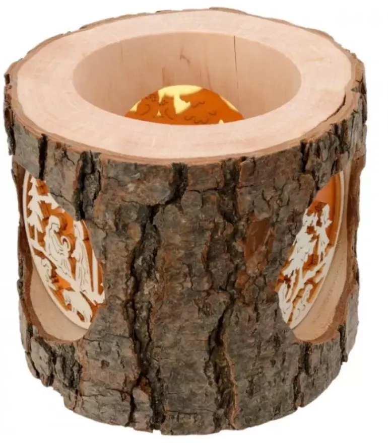 Photophore Dans Un Rondin De Bois Avec Trois Motifs Translucides : Crèche De Noël, Anges Accrochant Des Etoiles Et Bonhomme De Neige Allonge Et Biche.